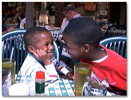 We arrived about 10 minutes early. Next to arrive was my sister Sue. She was ready for a day of baseball. Mouse (aka Mark) got away early from work and made it for breakfast. About 10 minutes later the Thomas Family's land yacht (actually Bevie's Dad's Lincoln Town Car) arrived with everyone aboard. We told the hostess we were all here, and she immediately escorted us to our awaiting table on the back patio. Talk about perfect timing!